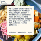 As a Greek family, we know how important it is to get this seasoning just right. Use our blend to season a Mediterranean style lamb or mix it with olive oil to make a delicious Greek salad dressing. Try adding it to traditional stuffed peppers and grape leaves, grilled fish, and oven roasted potatoes. You can also use our Greek seasoning in your burger mix for a twist on the traditional patty or simply sprinkle it over some feta and olives for a fresh appetizer.
