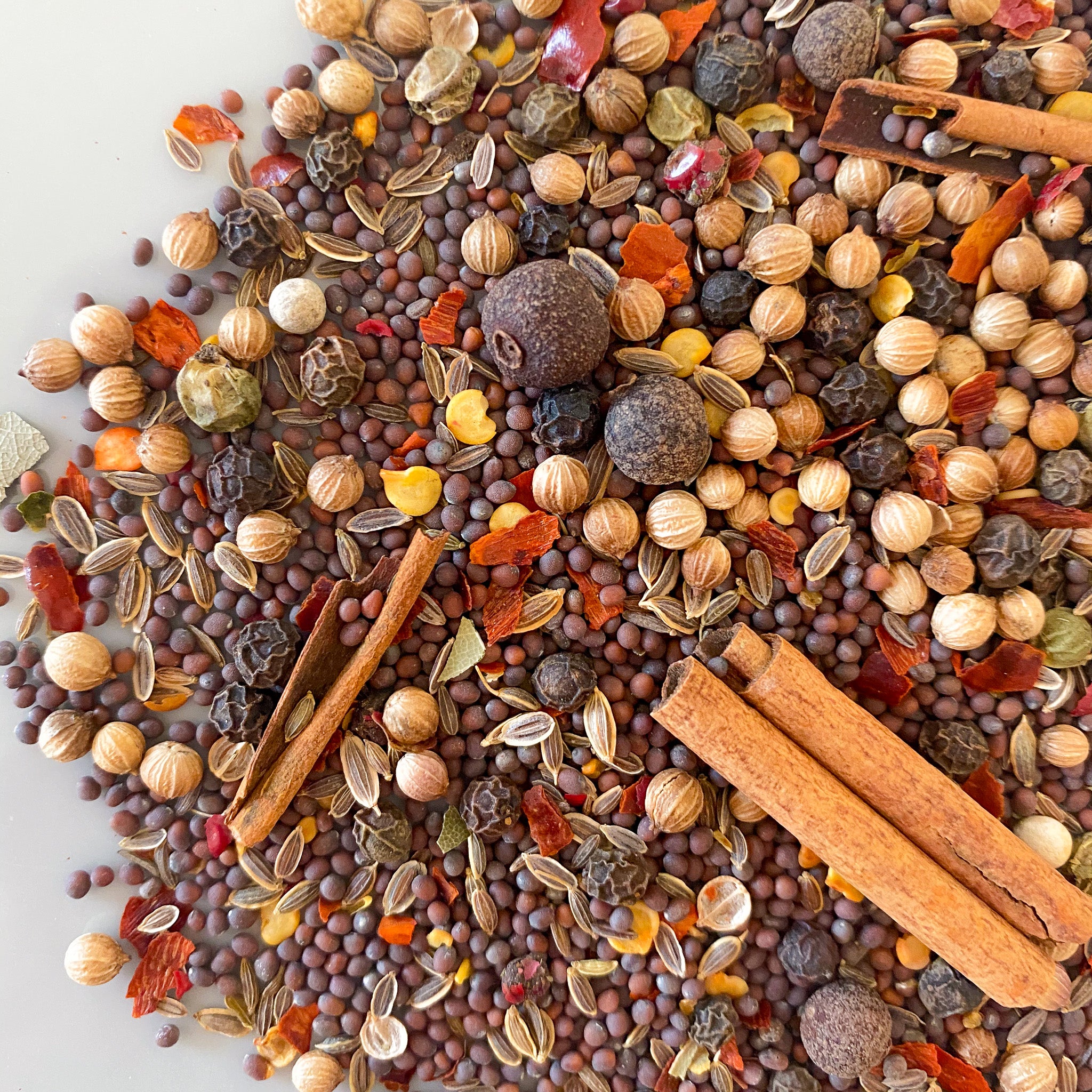 Ingredients: Brown Mustard Seeds, Coriander, Mixed Peppercorns, Dill Seed, Allspice, Cinnamon, Red Pepper Flakes, Cloves, Bay Leaves