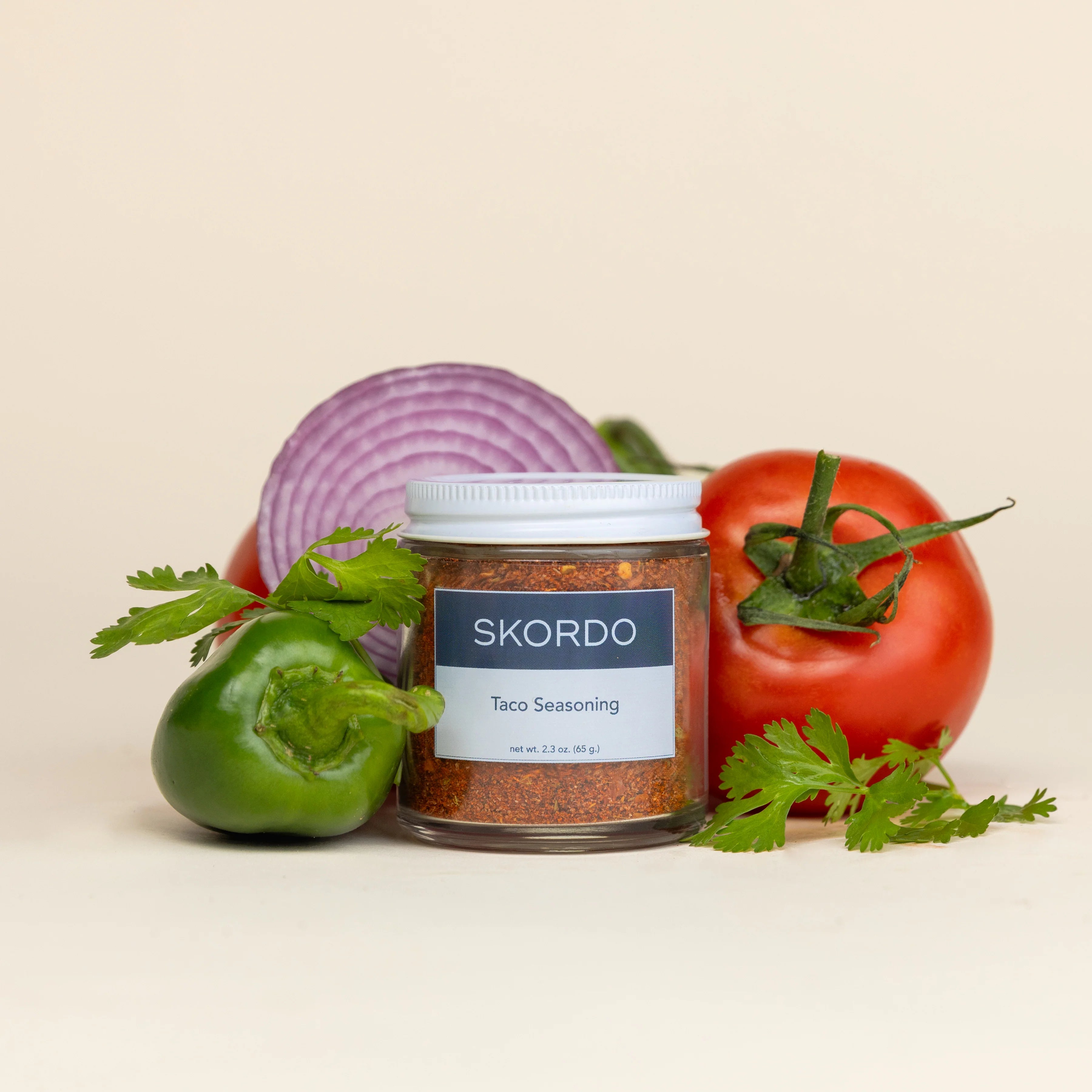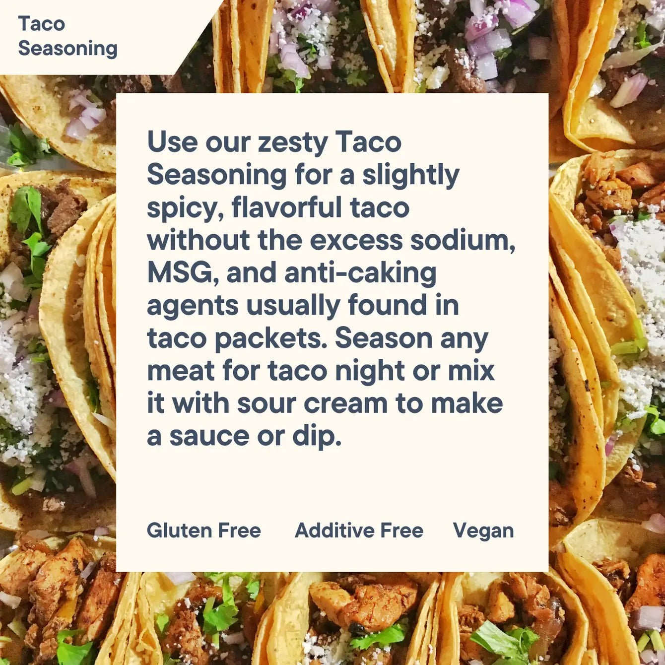 Use our taco seasoning for a slightly spicy, flavorful taco without the excess sodium, MSG, and anti-caking agents usually found in taco packets. We suggest 1-2 Tablespoons for 1 pound of meat, fish, or vegetables, depending on your heat preference. You can also use it in a taco salad or mix it with sour cream to make a taco dip.