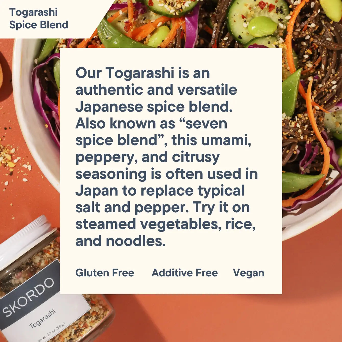 Togarashi is a spicy Japanese blend also known as "seven spice blend". Often found in Japan as a table condiment, it spices up fish, poultry, and beef. You can also use it to flavor steamed vegetables, rice, and oven fries. Togarashi's heat also goes well in noodle based soups and tempura dishes. For a unique snack, sprinkle it onto avocado toast or freshly popped popcorn!