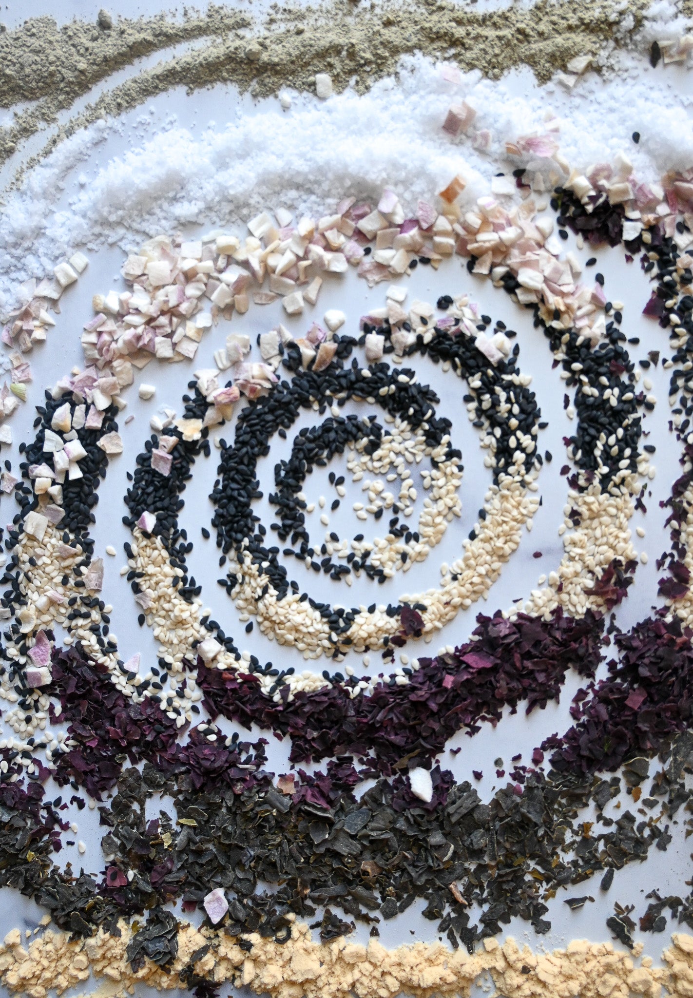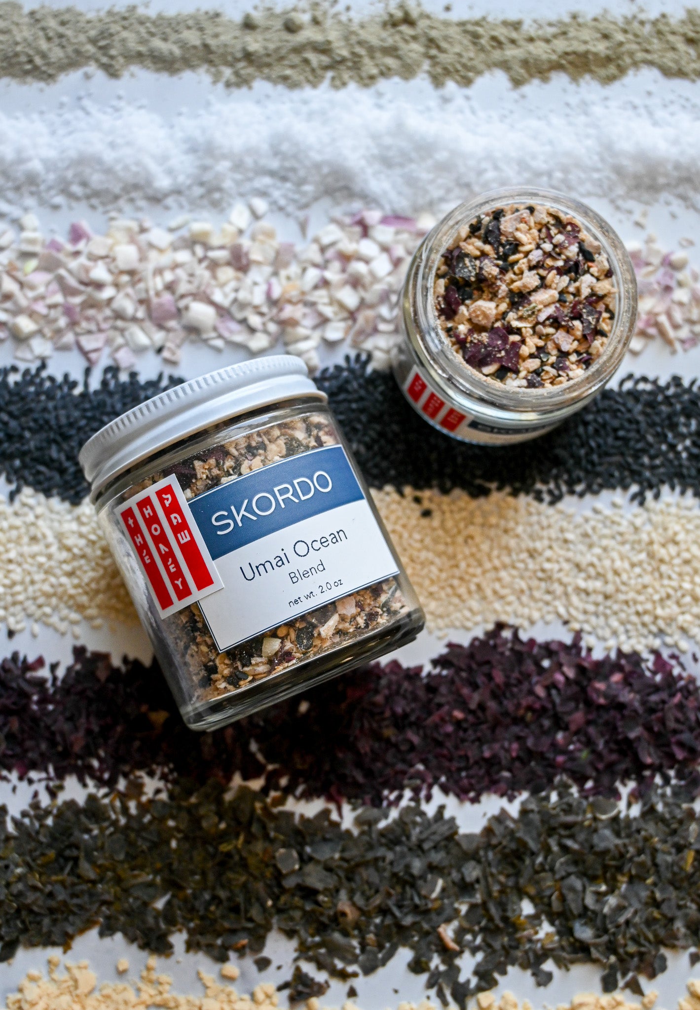 Ingredients: Black Sesame Seeds, White Sesame Seeds, Shallots, Shiitake Mushrooms, Granulated Sugar, Atlantic Sea Salt, Kombu Powder, Kashmiri Chile Powder, Lemon Zest, Miso Powder (soybeans), Dulce Flakes, Kombu Flakes