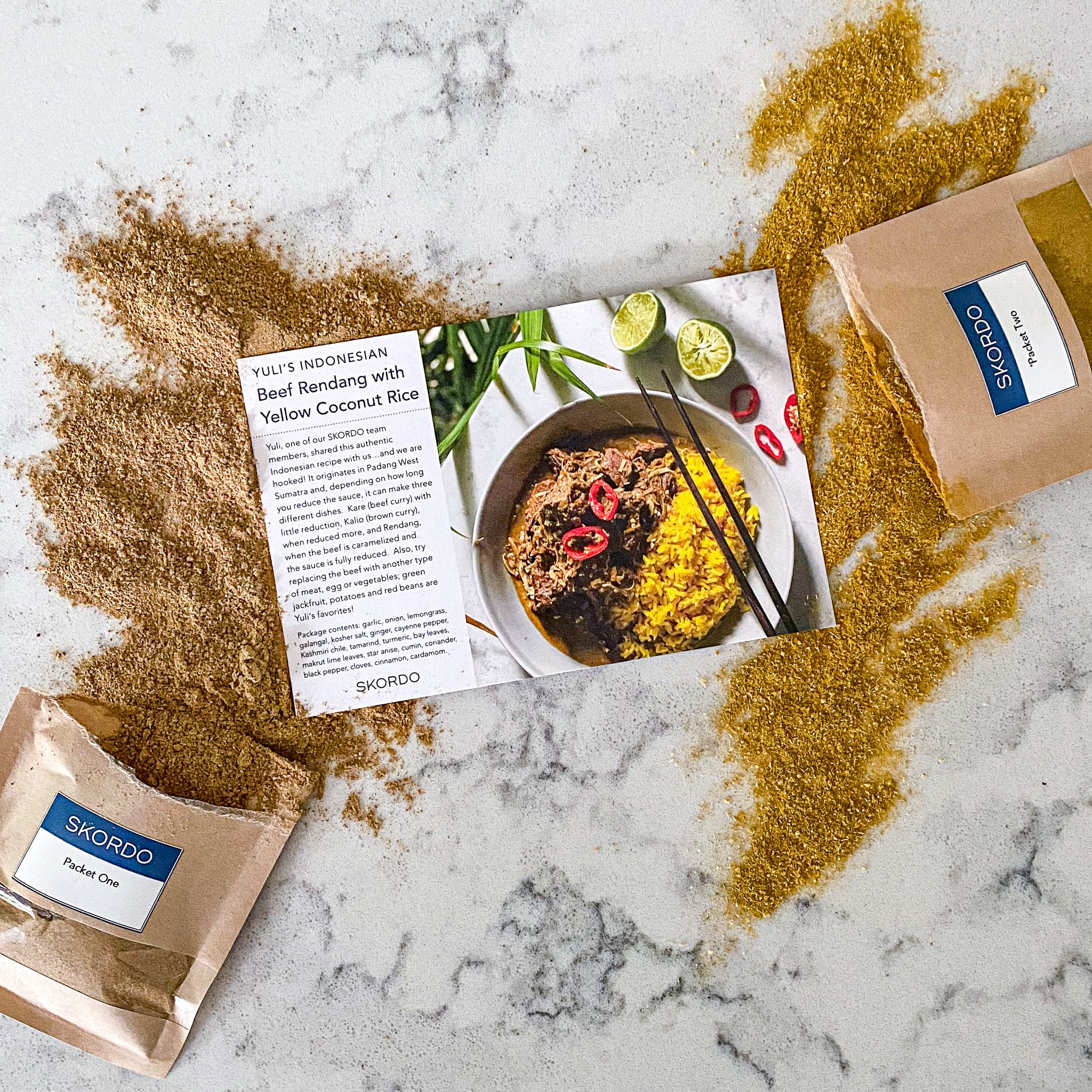 Yuli, one of our SKORDO team members, shared this authentic Indonesian recipe with us...and we are hooked! It originates in Padang West Sumatra and, depending on how long you reduce the sauce, it can make three different dishes. Kare (beef curry) with little reduction, Kalio (brown curry), when reduced more, and Rendang, when the beef is caramelized and the sauce is fully reduced. Also, try replacing the beef with another type of meat, egg or vegetables; green jackfruit, potatoes and red beans are Yuli’s favorites!