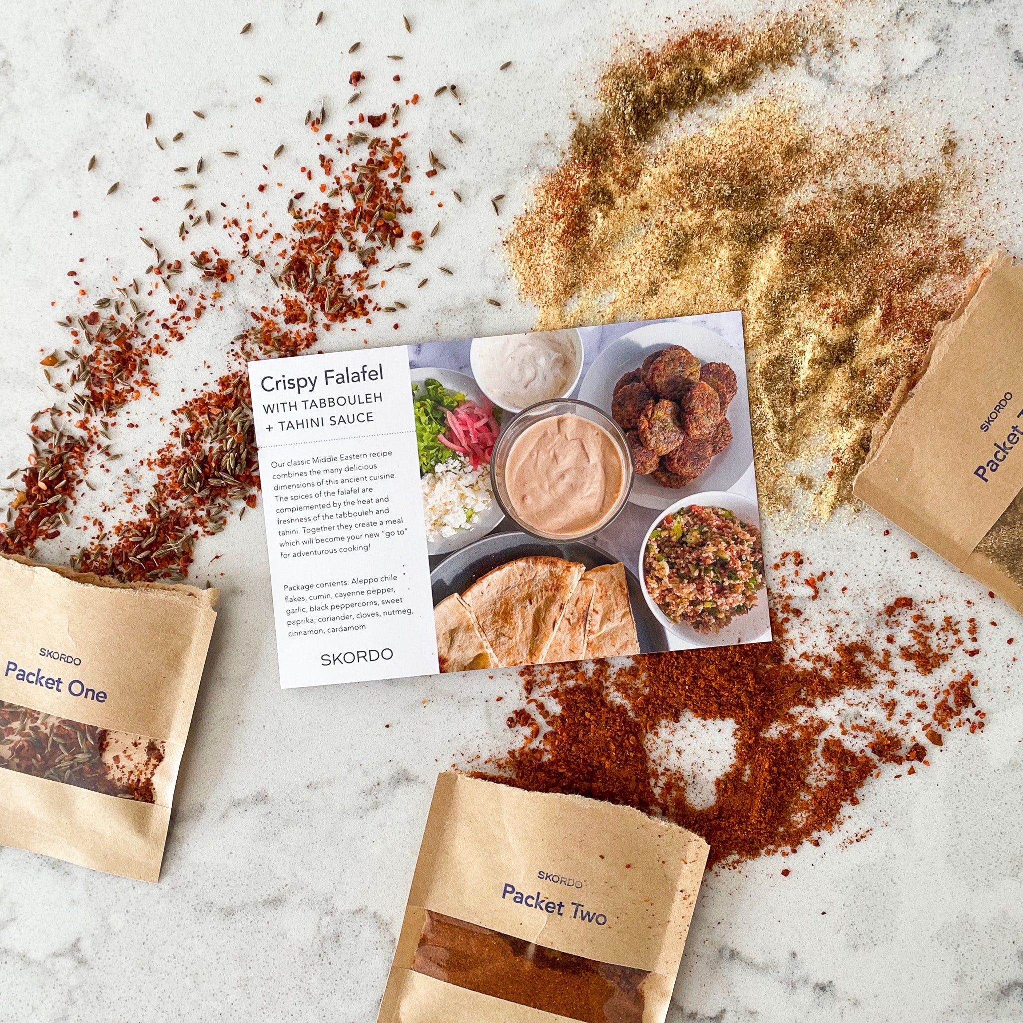 Package contents: Aleppo chile flakes, cumin, cayenne pepper, garlic, black peppercorns, sweet paprika, coriander, cloves, nutmeg, cinnamon, cardamom.
