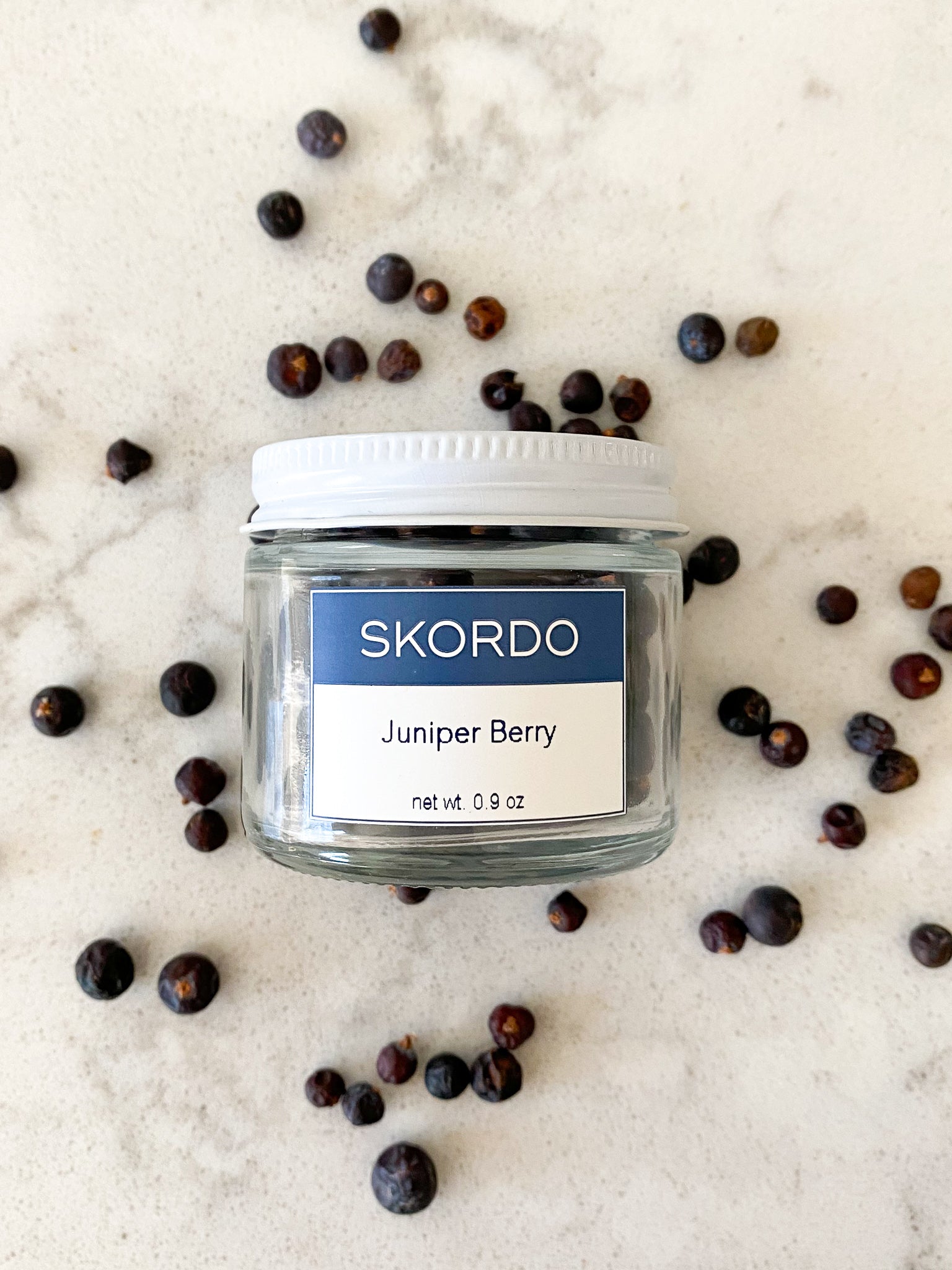 Juniper's aroma is pleasantly woody, bittersweet, and distinctly like gin. A natural pairing with fatty foods, these berries make a nice addition to beef, pork, bacon, lamb, and game birds. In addition to meats, juniper combines well with apples and cabbage. The berries are a key ingredient in Gin and Finnish Rye Beer because of their clean, sweet, and resinous flavor.