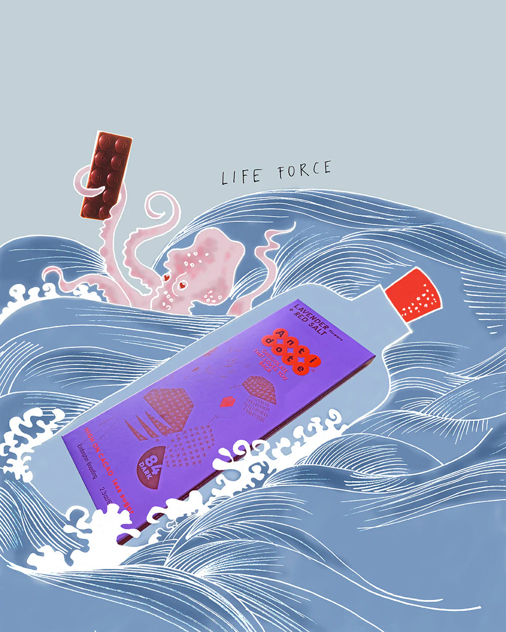 Let this luxurious chocolate bar become your ultimate pick-me-up, a true Antidote that nourishes and revitalizes when you need it. Admire the deep, glossy surface of the dark chocolate, speckled with delicate organic lavender flowers and earthy red alaea salt. As you unwrap it, a soothing aroma fills the air—floral lavender mingling with the bold, fruity notes of premium fine aroma cacao.