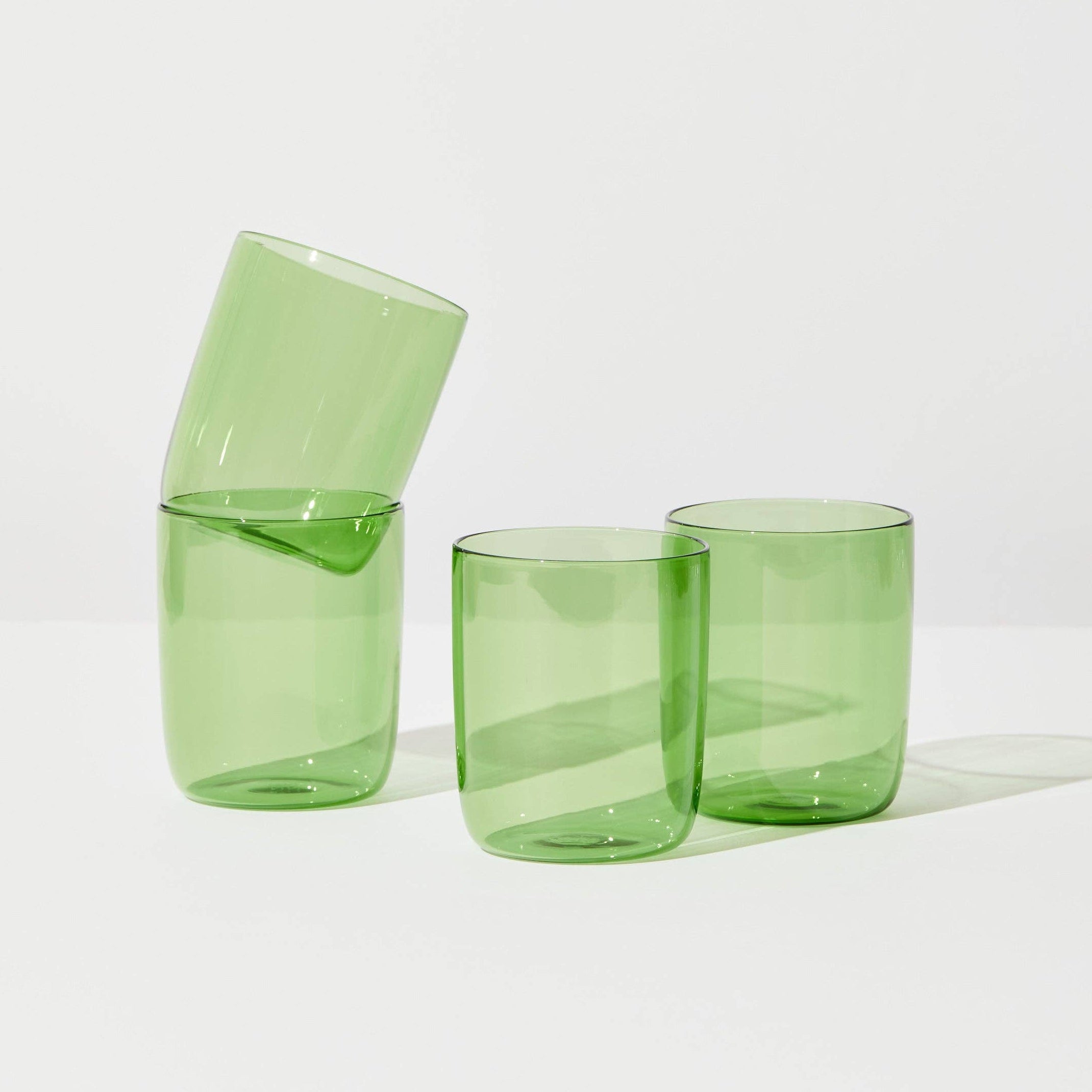 Handcrafted from borosilicate glass in a soft green hue, these four rounded cups bring a sense of joy and elegance to whatever you're drinking—be it water, wine, cocktails, or tea.