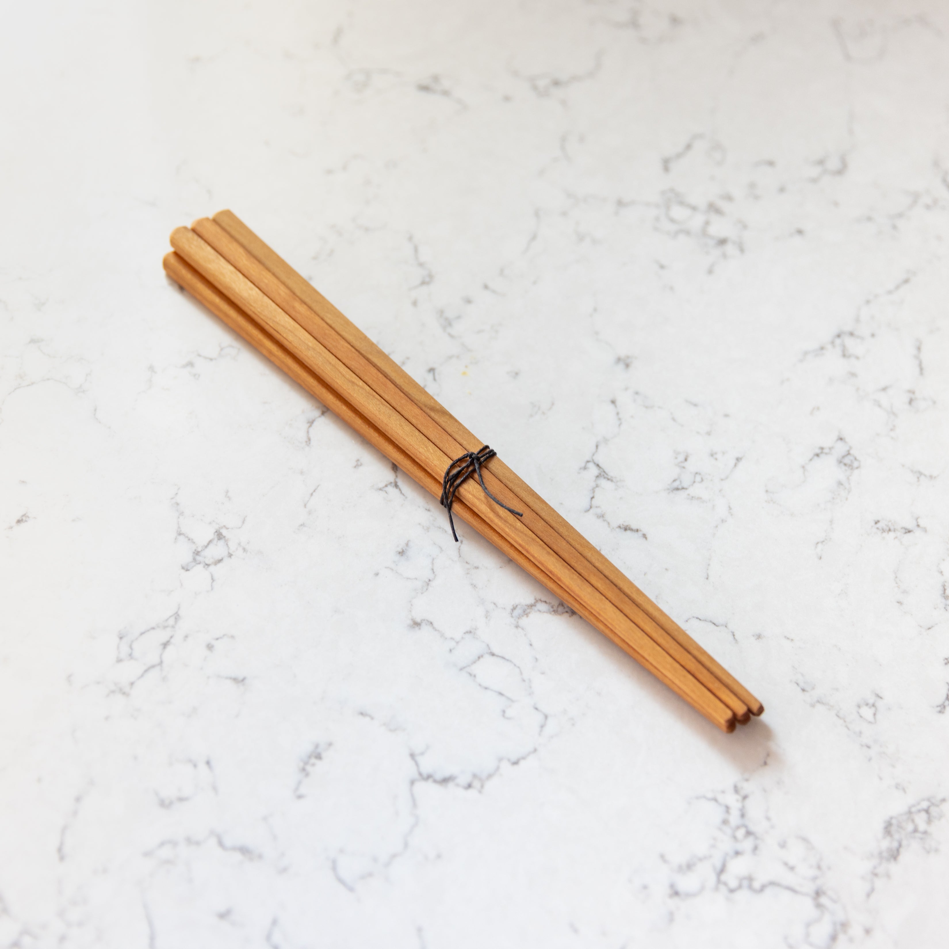 These sets of handmade chopsticks are made from beautiful and durable hardwoods and finished with a food safe oil. Each contains three pairs tied neatly with waxed cotton cord. Cherrywood. 9" length. Handmade in the USA.
