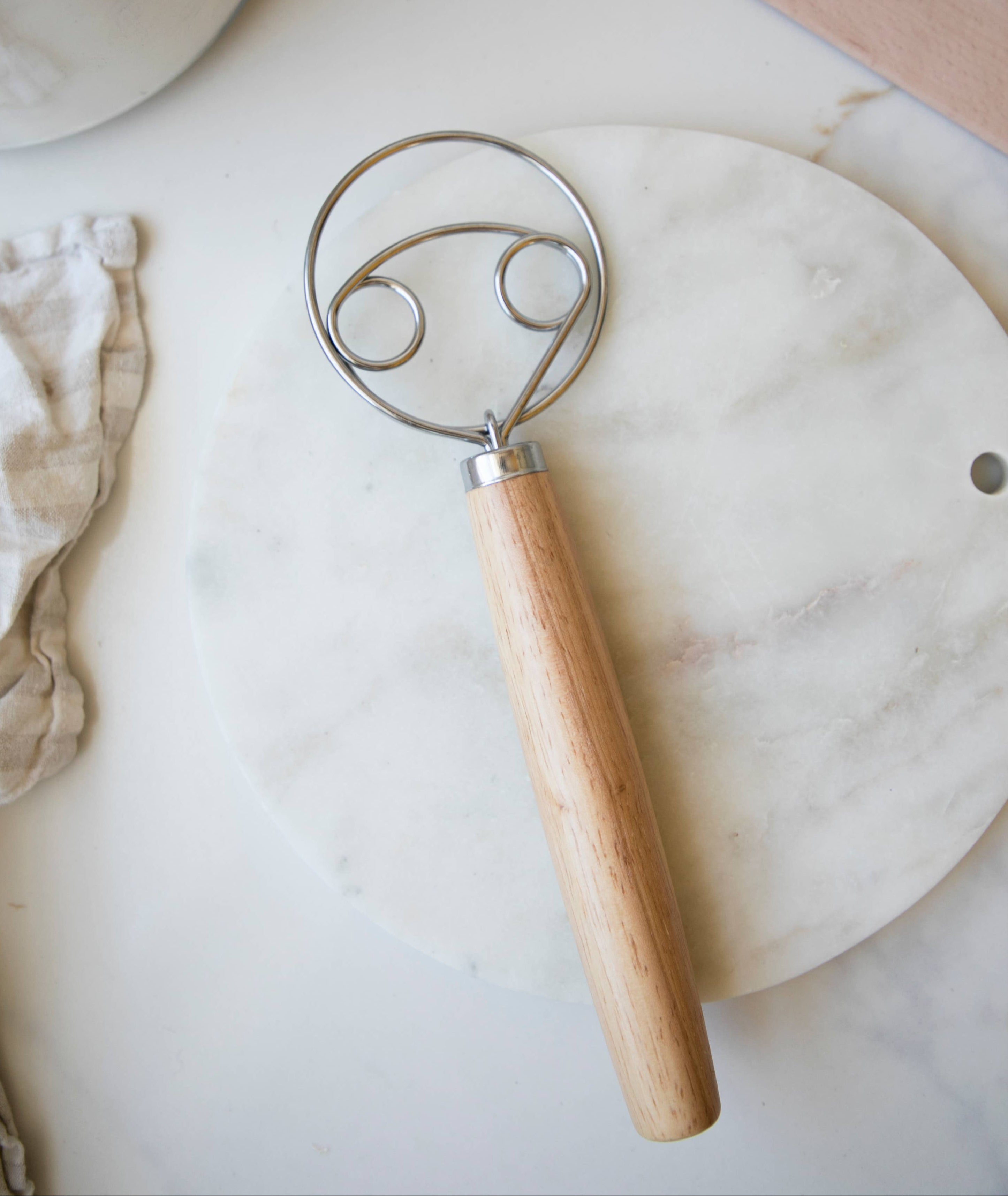 An efficient tool for mixing thick, sticky doughs and batters, the Danish Dough Whisk keeps ingredients moving freely through its open coils instead of clumping, as they often do with spoons or balloon whisks. The design makes it quick to incorporate wet and dry ingredients, fold in additions like nuts or chocolate chips, and even scrape down the sides of the bowl — all while keeping hands cleaner.