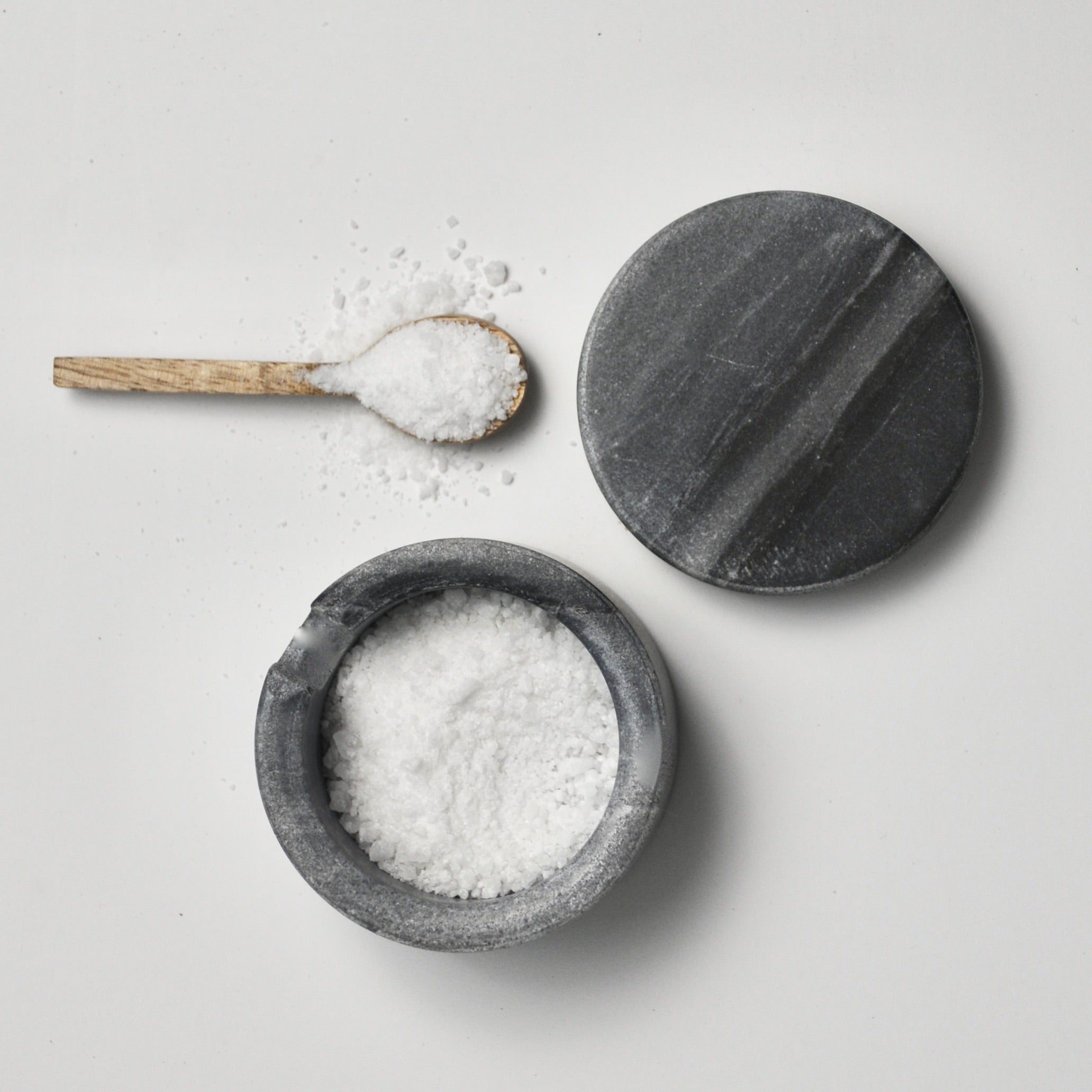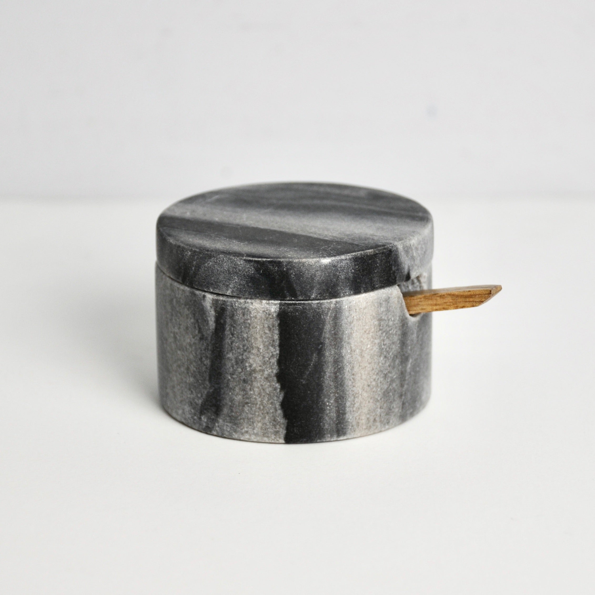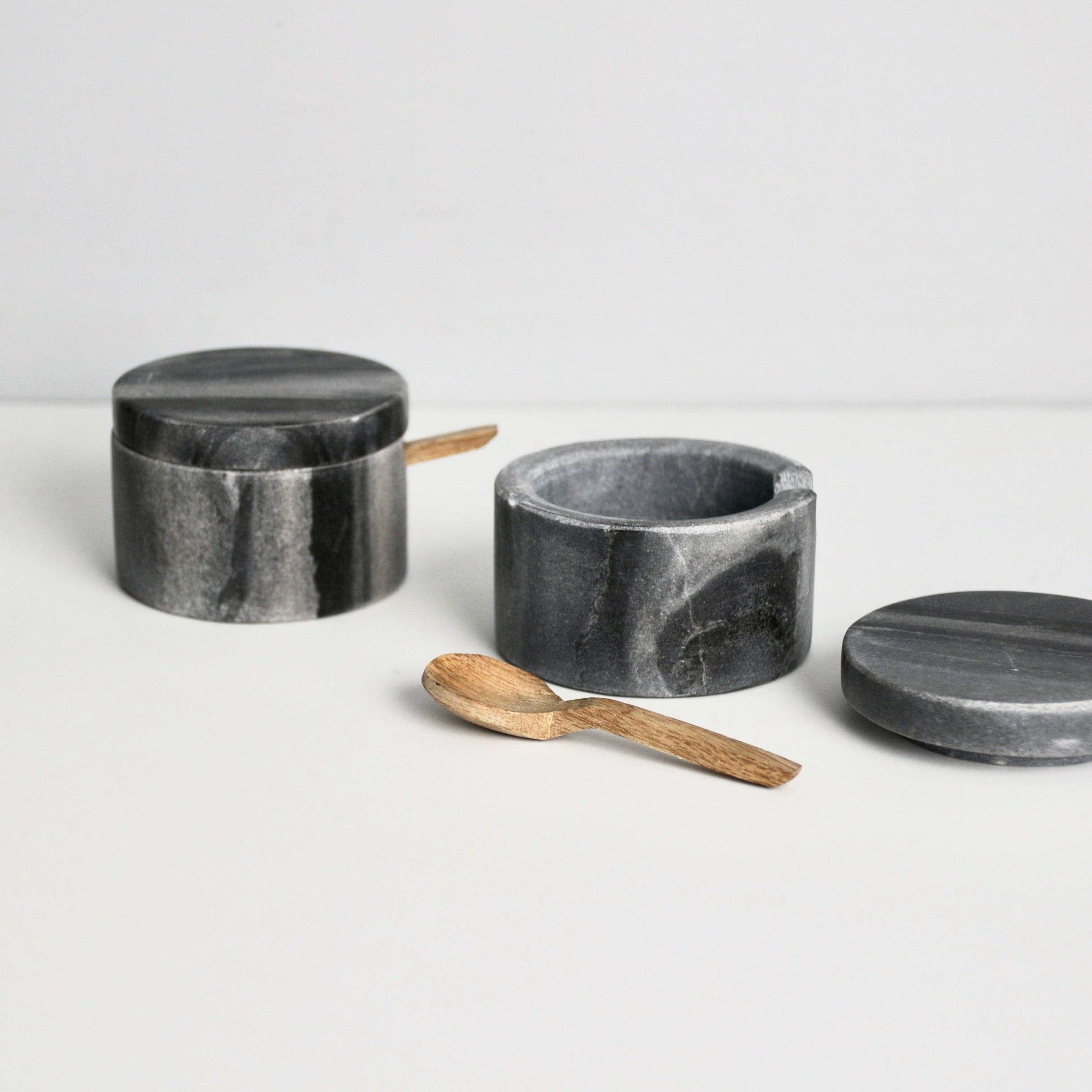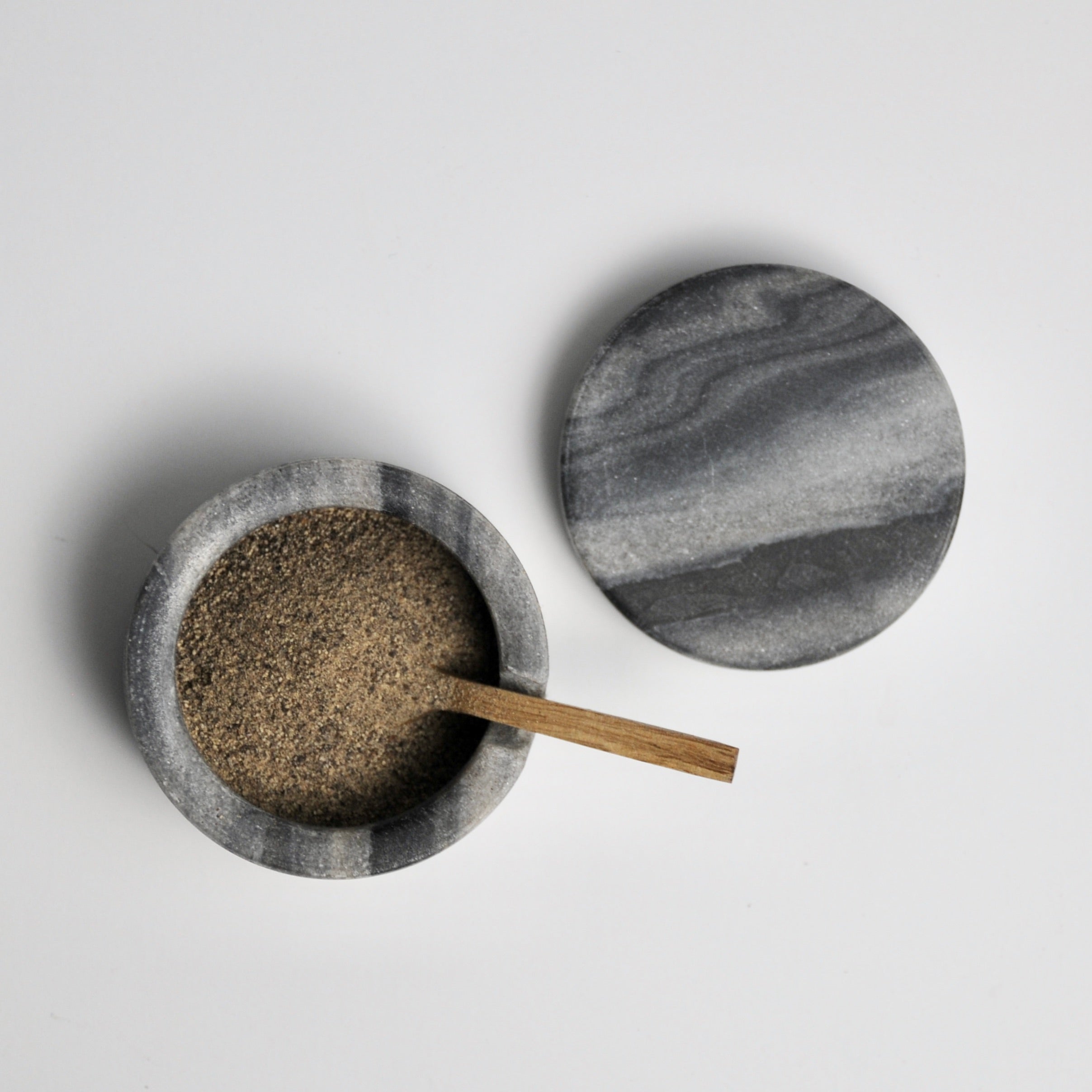 This is one of our favorite new additions - a mini marble salt or ground pepper cellar! This cellar is completed with a hand carved wooden serving spoon. Try it as a dried herb cellar too!