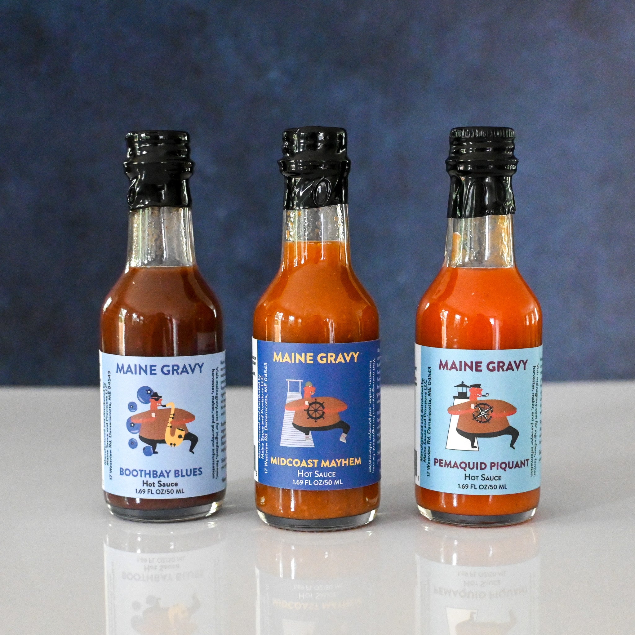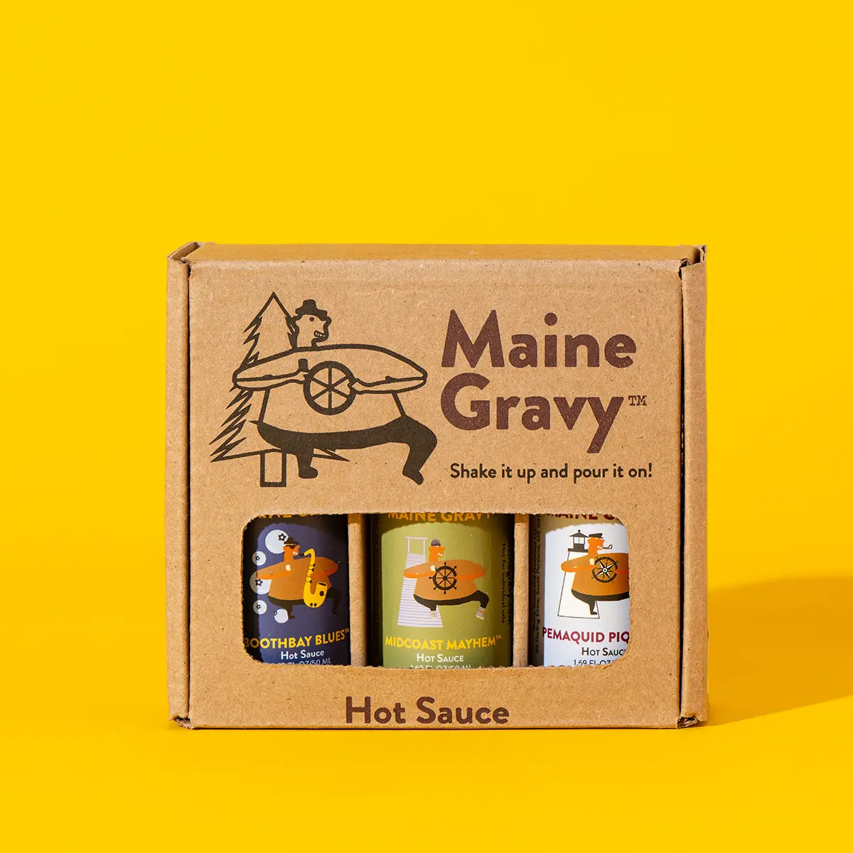 Introducing the Maine Gravy Hot Sauce Sampler Box! a delightful assortment of Maine Gravy's best-selling sauces, now available in one convenient and compact package. This box makes a great gift or kit to keep in the car for the avid traveler and foodie. Inside this box, you'll discover three exquisite flavors: Boothbay Blues, Midcoast Mayhem, and Pemaquid Piquant.