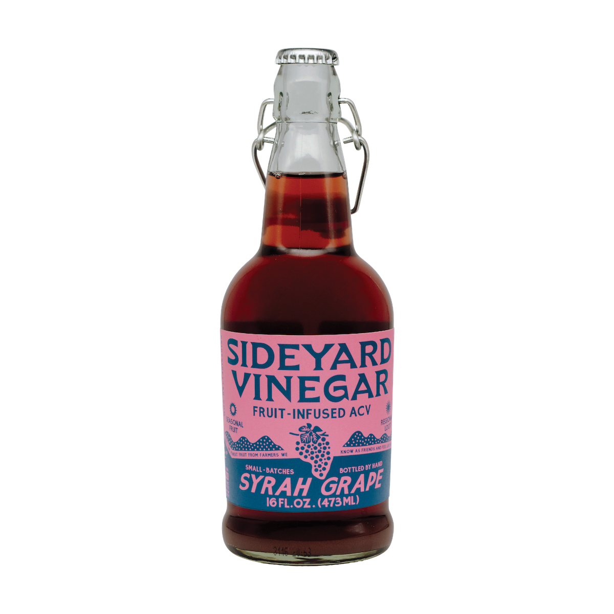 Sideyard's Syrah Grape Fruit-Infused Vinegar perfectly preserves the flavorful one-two punch of rich opulence and lively, high-toned pizzaz characteristic of estate-grown syrah grapes from Stolpman Vineyards. This Syrah Grape Vinegar is made with a base of organic apple cider vinegar (ACV) and has no added sugar. Pure in flavor, strong in taste, and full of good-for-your-gut probiotics, Sideyard Vinegars are alive, raw and bottled with the mother.