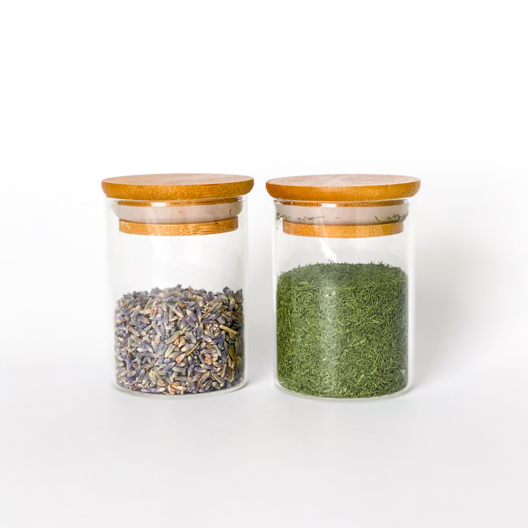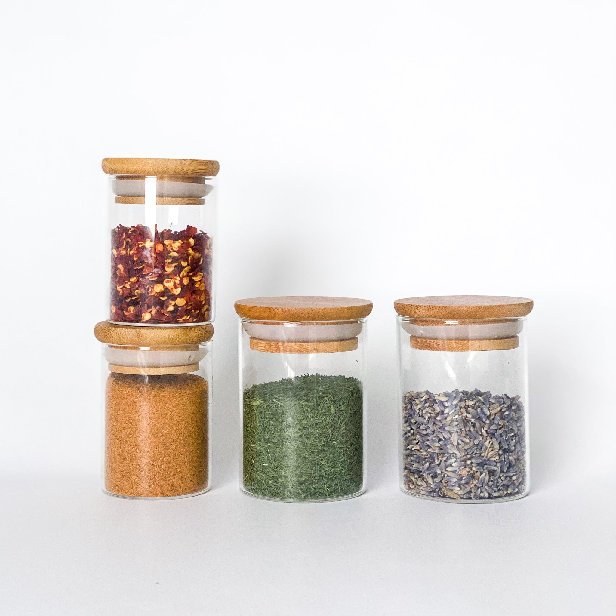 These spice jars are so simple in design with a bamboo top and plastic ring to seal in freshness. They hold approximately 4 ounces and are perfect for storing things like bay leaves, cinnamon sticks, and much more! Showing off the colors and textures of their contents, these also work well with labels on a tiered shelf for all your spice storage needs.