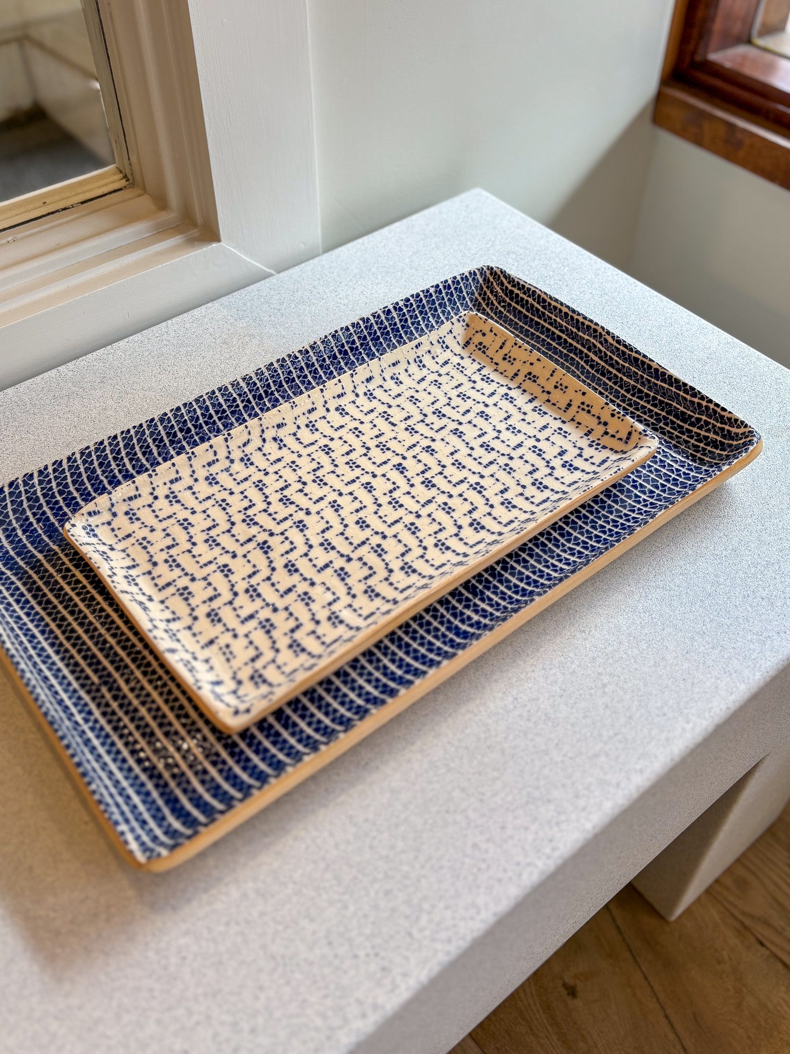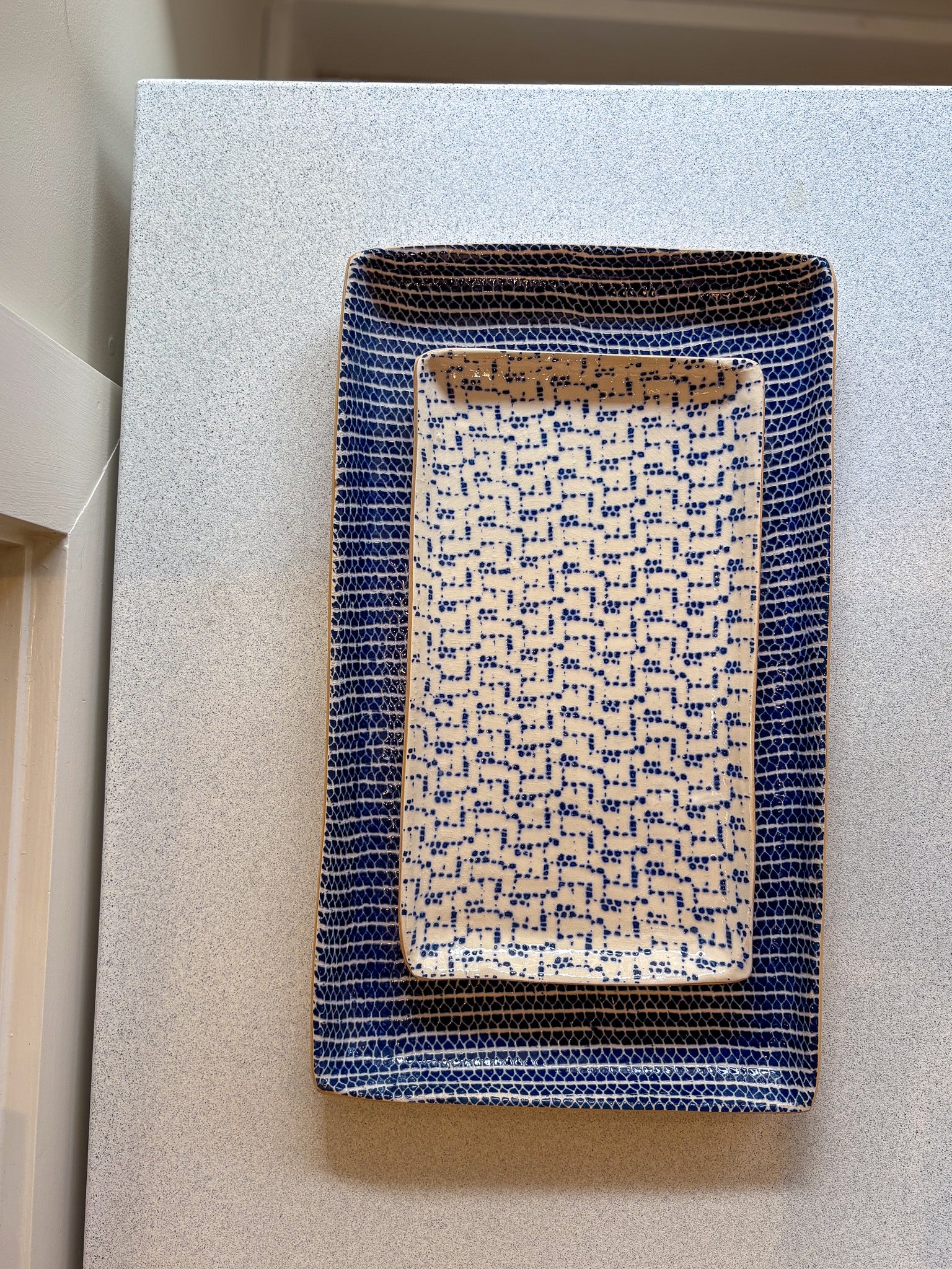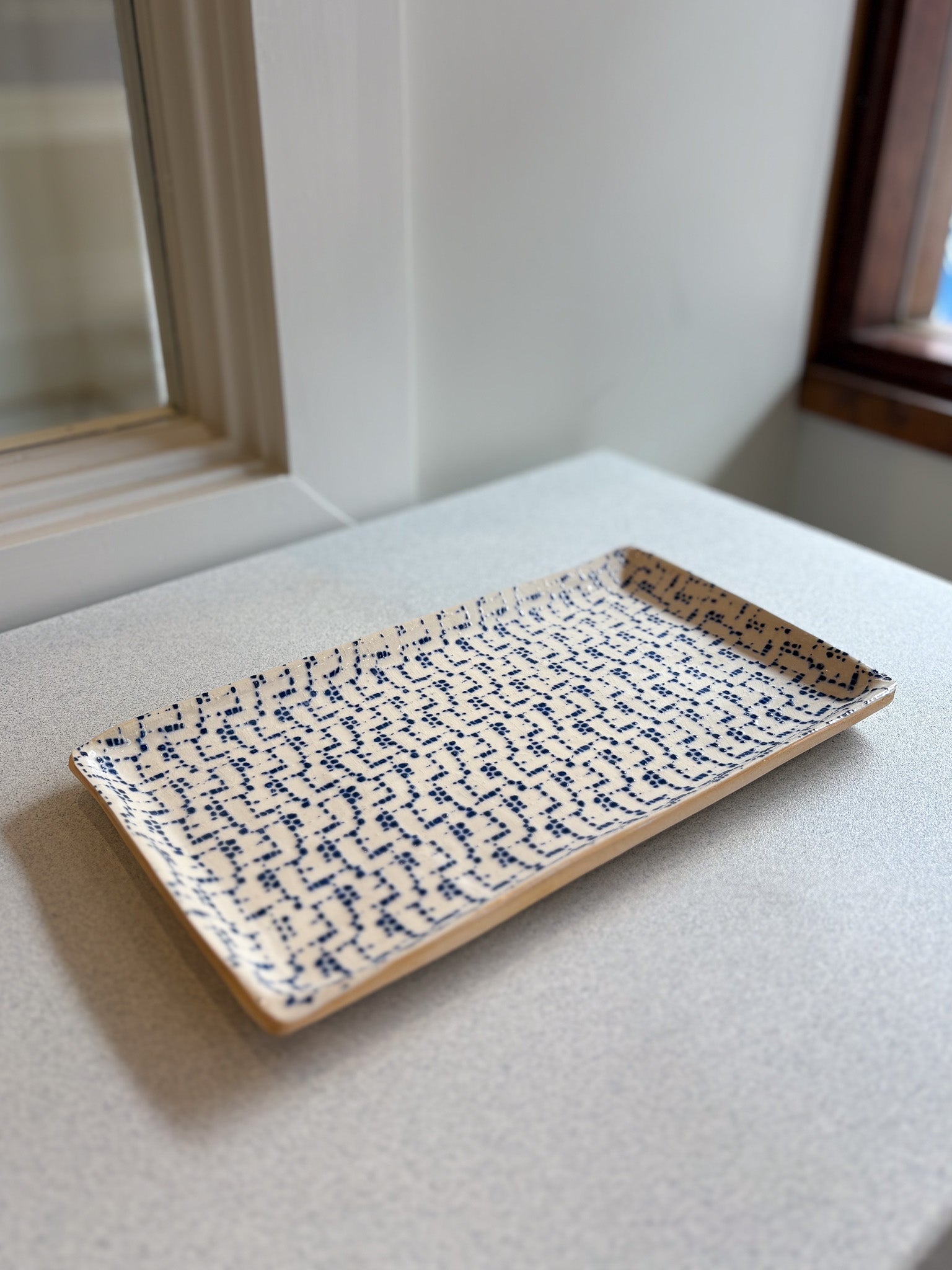 Elevate your table setting with the Terrafirma Ceramics Small Stacking Rectangle in Cobalt Maze.