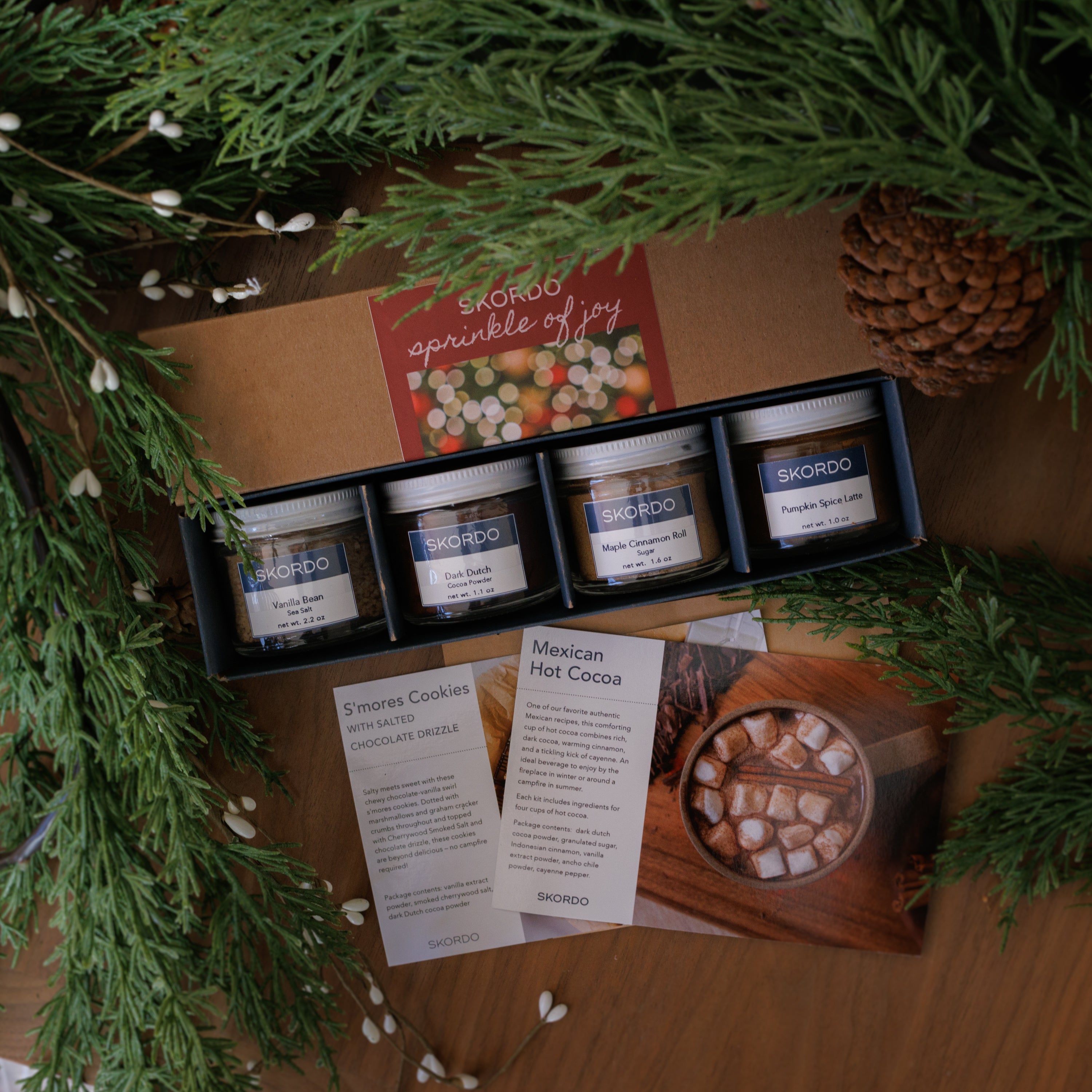 - Plus four sweet SKORDO favorites in a holiday gift box: Vanilla Bean Sea Salt, Cinnamon Roll Maple Sugar, Dark Dutch Cocoa Powder, and Pumpkin Spice Latte Blend in a festive gift box