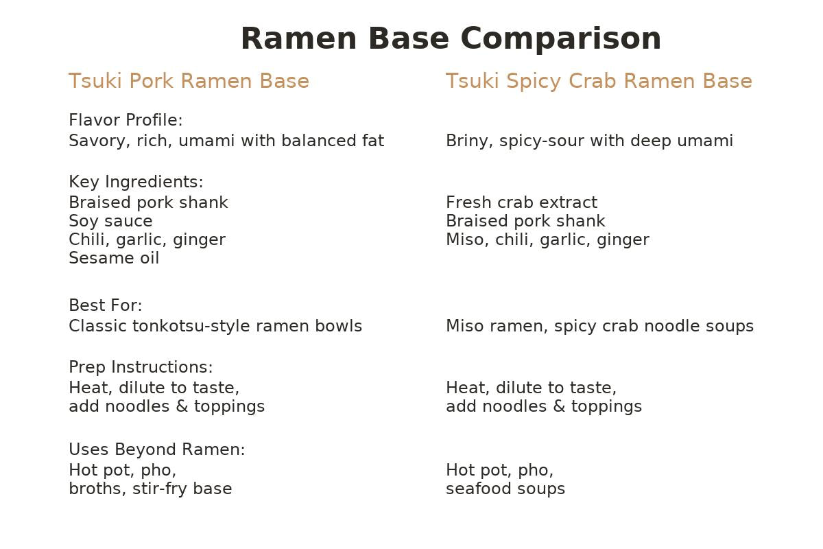 Rich, briny, and beautifully bold, this miso-based ramen broth brings the depth of traditional Japanese ramen to your kitchen in minutes. Crafted by Ramen Master Tsuki, the base combines fresh crab extract, braised pork shank, fermented soybean paste, sesame, fish, and a balanced mix of chili, ginger, and garlic. The result is a flavor-packed broth with a warming spice and deep umami finish.